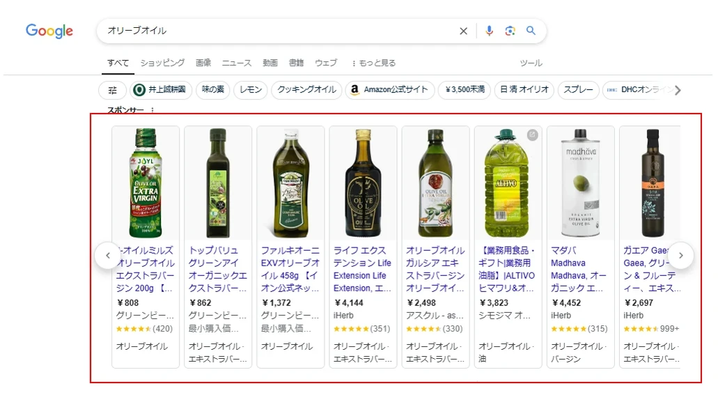 新規顧客獲得のためにイオンネクストのマーケティング部が選んだ施策の一つが「Googleショッピング広告」(以下ショッピング広告)だ。 これは、Googleで商品名を検索する際に、検索の結果が表示される画面トップに掲載される広告である。
